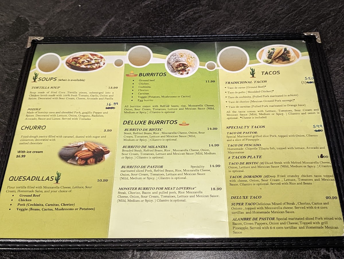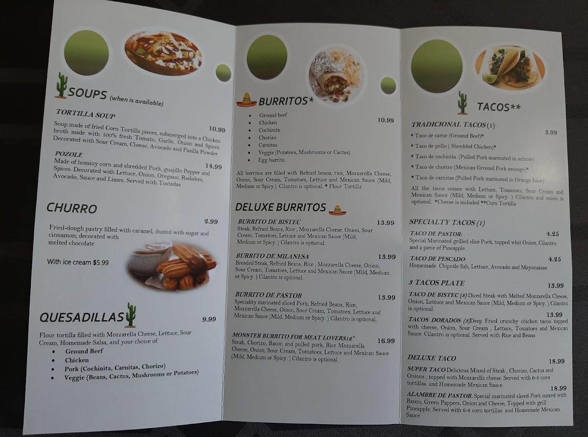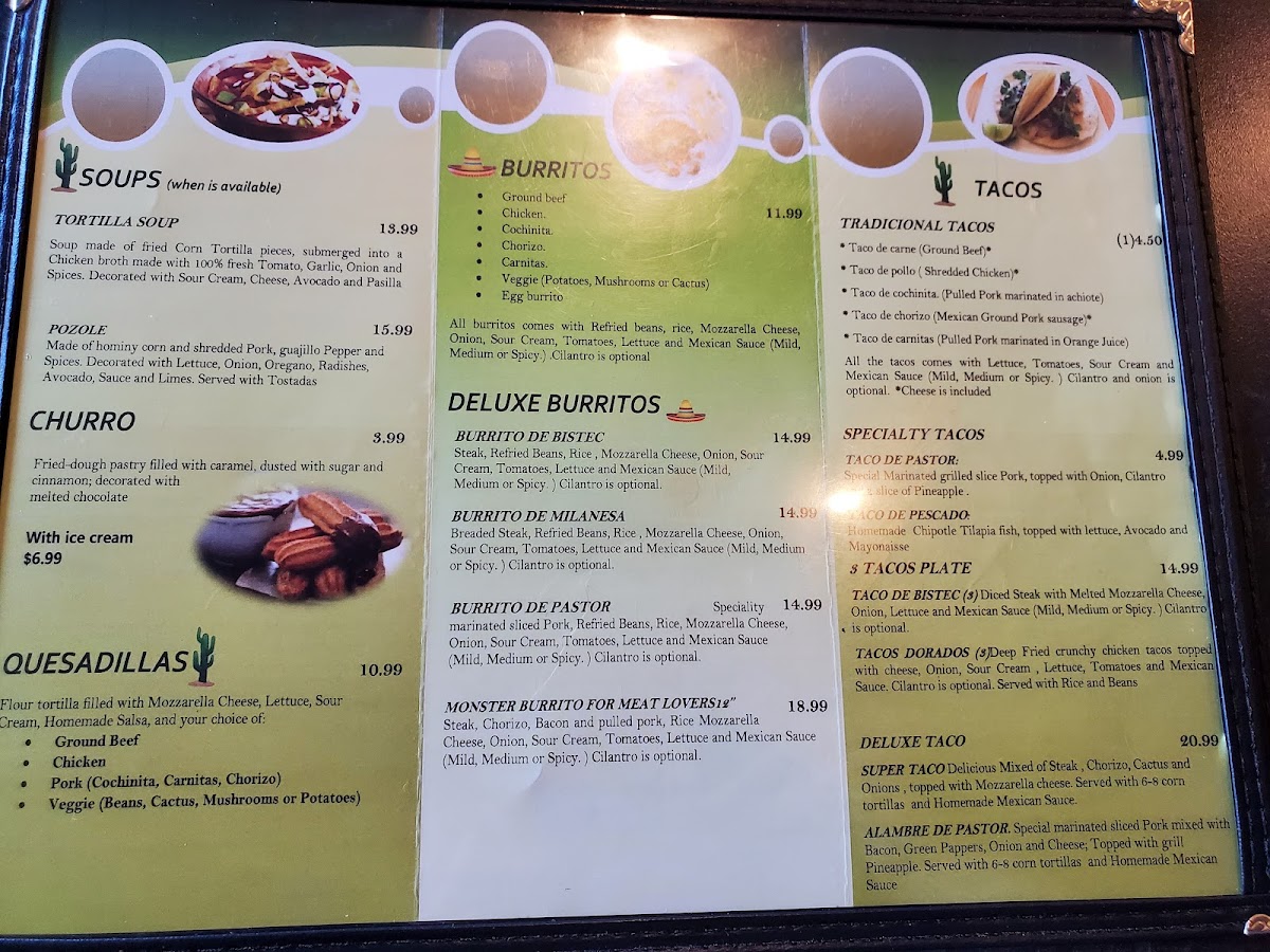 The menu features a tempting array of traditional plates, including Enchiladas Verdes and Chimichangas, each bursting with flavor. For burrito lovers, the Deluxe Burritos, such as the Burrito De Bistec, offer a hearty meal at a reasonable price. Don’t miss their specialty tacos—particularly the Taco De Pastor—that patrons rave about for their authenticity and richness.